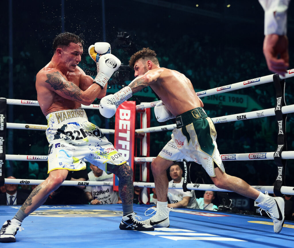 Warrington entrou com a necessidade clara de pressionar desde o início, impor volume e tentar transformar a luta em um combate físico, truncado e desconfortável — território onde sempre se sentiu mais à vontade.